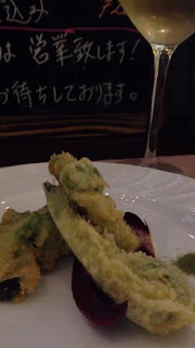 お通しはホタルイカ、前菜代わりに春野菜のフリット、メインはロバ(!)。